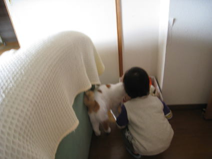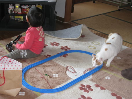 昨日、娘家族が遊びに来ました 私がカーペットを敷いて支度してた側で はなみはいつものようにチェックしてました 早いもので1歳6カ月になりました 片言でお話しします(分からないと娘の通訳が入ります) 父親の影響で汽車、電車が大好きです ちょうどTVで汽車が映ったら「シュシュポッポ」と大騒ぎです 映ってる時はテンションアップで見てましたが 他の場面で映らなくなると 振り返って「なぜだぁ~」と怒って騒いでました(笑) はなみは「ニャンニャいたぁ~」と追いかけられながら 側でウロウロ見てました 今日のはなみはめずらしく押し入れの中で寝てます 昨日はよほどお疲れのようです 「ゆっくり休みなさい」