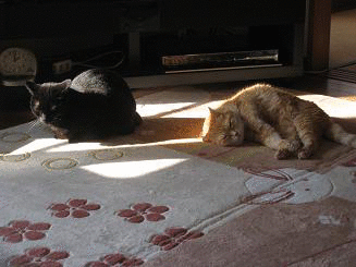 関東地方晴天続きで乾燥注意報発令中 風邪をひかないように要注意です ももとくーはポカポカのカーペットの上でごろり はなみはガラス戸の一番暖かい場所で