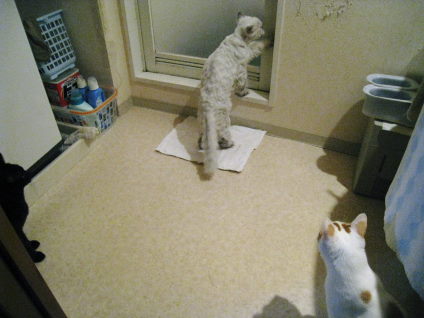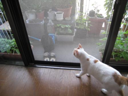 梅雨の中休みは暑いです 朝ベランダにみんなを出して洗濯物干して 用が済んだのではなみと一緒に入りました いつもはなみが最後に入るのでもう誰も出てないと 思ったのに くーがまだ出たままでした くー「はなみ開けて」 はなみ「くーちゃん何してるの?」 面白いので見てたら、泣き虫くーが騒ぎ出しました アミ戸を開けたとたん、はなみにネコパンチやられてました