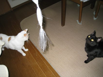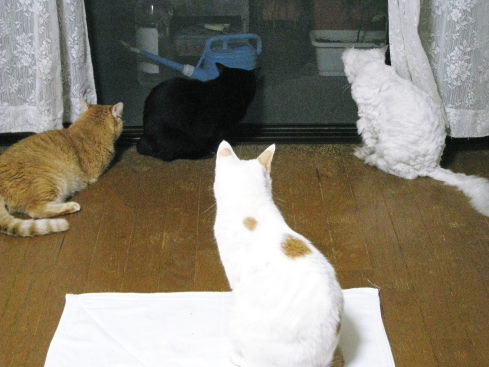 テレビを見てたら「バタバタッ」とセミが ベランダに飛び込んできました どこに居たのか4人いっせいに集まって来ました ニャアニャア騒いでましたが お父ちゃんが捕まえてみんなに見せた後 近くの大きな木めがけて逃がしてあげました