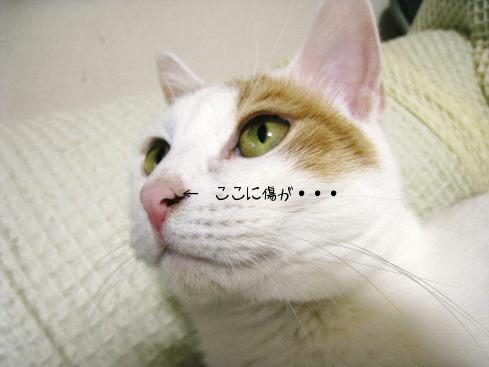 はなみは末っ子でやんちゃだから みんなと遊びたくても敬遠されがちなんです ある日 ももが通ったのでちょっかい出したんです ももが怒って飛びかかり喧嘩になりました はなみが私の所に飛んできて 口の周りをベロンベロンなめるんです 引っ掻かれたかと思って嫌がるはなみを捕まえて見たけど なめた後で血が出て無いので大丈夫だと思ってました 何日か経ってはなみの顔を見てたら・・・ 鼻に傷が付いて少しえぐれてました 可哀想に乙女の大事な顔に傷がついて 嫁に出す予定は無いので良いのですが・・・ 四姉妹仲良く遊んでもらいたいです