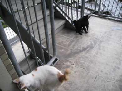 携帯の帰るコールが鳴るとそわそわするはなみ 時間を見計らって出してあげました 久しぶりのお散歩です 気を付けないとくーが上の階に行くので目が離せません 非常階段の踊り場です くーは体をすり付けて白くなってしまいました はなみは下をのぞくのが好きなので見てました エレベーターからお父ちゃんが出てきたら くーは急いで家の中に入り はなみは足にまとわりついて甘えてました