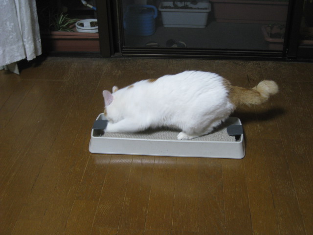 爪とぎダンボールを取り替えました まず一番は、はなみです 新しいので念入りにガリガリやってます はなみが終わったらももの番です 順番に回ってくるのを待ってます