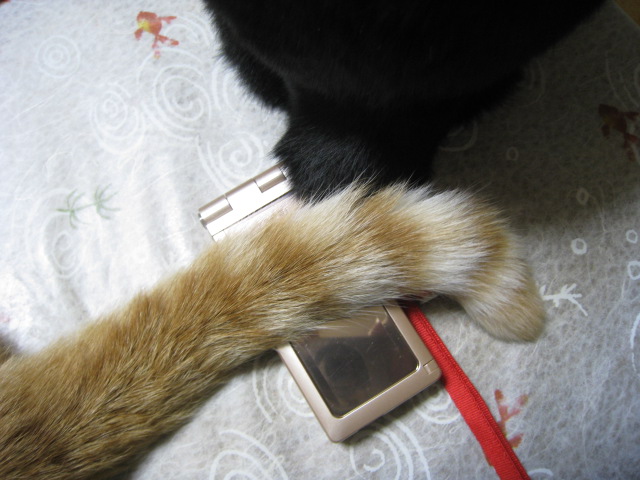 もも姉ちゃんとくーちゃんです しっぽが重なって可愛いです でも・・・何で携帯の上なの??