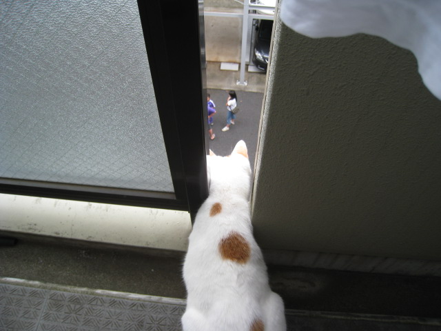 ベランダに出ると下を見る これはなみの日課です 下に親子連れさんが・・・ 車が出るまで熱心に見てました