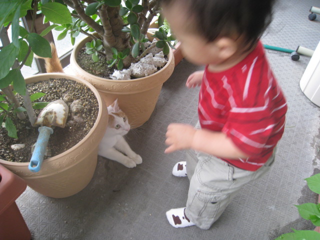 昨日 娘一家が遊びに来てくれました はなみは気になって側に来て見てます 坊ちゃんの動きが早いので 捕まらないように逃げたり隠れたりしてるけど 2人は仲良しなんです ベランダで鉢合わせ 2人見つめ合ってます