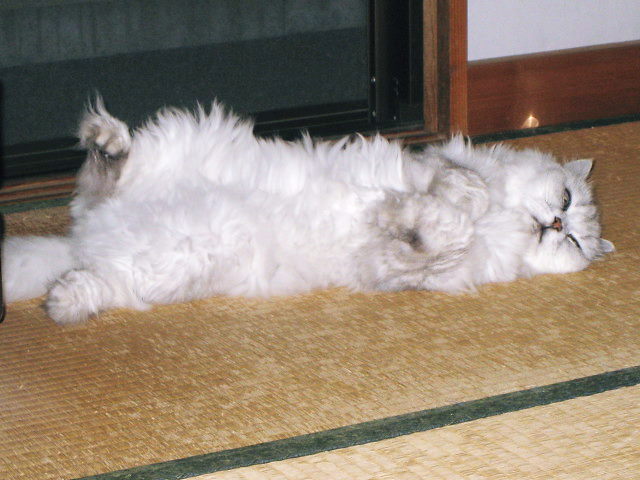 これからの時期 毛長のちゃびの寝姿はいつもこうなります 薄眼を開けて大いびきで寝るんですよ 暑さに向かって毛がだいぶ伸びました 「そろそろ刈るか」の声で逃げ出します
