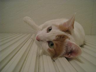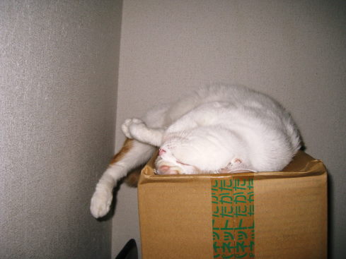 はなみ最近のお気に入りの寝場所 高さ1M位のダンボール箱の上 体がはみでてて寝がえりしたら落ちそうです 風通りの良い部屋で昼寝中です