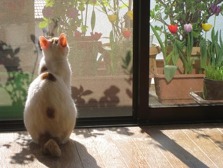 どこから飛んできたのかしら 部屋の中からはなみに教えたけど気が付かず・・・ 私が急いで外に出て 「ここだよ」と指さしたら気が付いて アミ戸に顔付けてクンクンしてました 可愛かったので パチリ