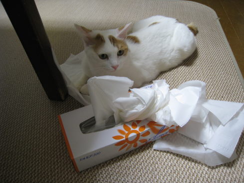 おとなしいなぁ~と目をやれば あらあらやってますよ そんなに引っ張り出してどうするの 怒ったらいつもの場所で反省してました 可愛いから許しちゃうけど 本当はいつもこのような恰好で寝てます