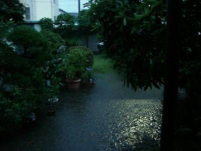 そう云えば丁度1ヶ月前の7月4日(金)午前4時前後の、およそ30分のあいだの出来事。富士市が集中豪雨に見舞われた。寝ていたが屋根が潰れるのではないかと思うほどひどい雨。とび起きて外を見たら、家の前の幅3M.深さ2M.もある「宮川」が氾濫して 我が庭一面20センチぐらいの水浸し・・・ウワ~大変!!でも その時はもう最高時より5センチほど水は退いていた。(植木鉢に跡がついてた)急いでドアを開け玄関から写真を撮った。そのうち見る見る水が退いてきた。氾濫も早かったが 水の退きも又早くてビックリ。5時過ぎ明るくなって 家の周りを一回りしたら、川端の小さな物置の中は水浸し、おまけにその前に置いてあった枕木が 上に置いた植木と共に1メートルも流されてズレていた。し、裏の洗濯場の屋根下に居る犬 マック もずっと立っていたようで、続きの物置も浸水して。下段の石油ストーブ他 全部出して捨てたり乾かしたりで、金土日片付けが大変でした。