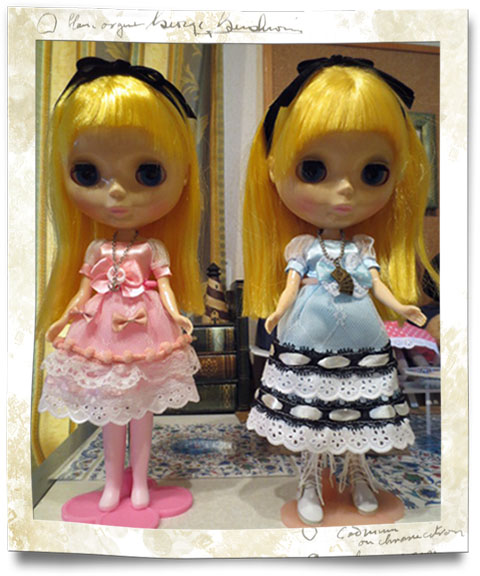 家のキュー太郎がどっちかわかりますか?!新しいコにも100均エリーちゃん改造服をきせる私…。(ブルーの服が新しいコです)なんとなく、家のコ(先にいるキュー太郎)の方が、いたずら好きな顔しています。新人は、どことなくオドオドしている感じが…(キューちゃんお手柔らかに…)新人さんの右手に早くも色移りを発見!!ボンドパック実行中です。(早くなおりますようにーー(T_T))アリス的ドールゆぇ、キューちゃん2号といつまでも呼ぶわけには…。昔、学生の頃のバンド名が『アイリス』だったので、これにしようかな~という感じです。(^○^)/