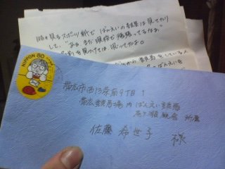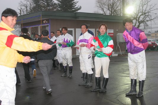 一週間位前の事です。レースに騎乗後にパドックの横を通って帰ろうとしたら「キヨちゃん、キヨちゃん!」と柵ごしに呼びかける女の人が。あれっ!? 懐かしい顔。私、厩務員2年目の秋に落馬をして左膝の靭帯を切っちゃって約8ヶ月休業していた事があるんだけど、札幌の実家に帰って市内のNTT病院て所に入院したのが12月の初めか中頃。検査で膝に数ヶ所の穴をあけ、本番の手術に備えたんだけど麻酔のききが悪かったのかどうなのか今でも新しい靭帯を通す穴を骨に開けていた痛みの無い妙な振動を覚えてます。その時に少し遅れて足首の骨をポキッとやって入院して来たのが声をかけてきた彼女なんです。部屋は違ったけど年が近い事もあり意気投合。ススキノで若くしてママをやっていたんだけどお見舞いに貰った差入を松葉杖つきながら持って来てくれたり、毎日消灯時間になんて寝れないから3階から1階まで二人でバレナイように別々に行って深夜まで喫煙所で喋ったり。ご飯に飽きたと言ってはビッコどうしで目の前の中華のランチに行ったり。相部屋の人とも皆長期だったから仲良かったけど彼女とは退院後も退院祝だー!って言ってお店にも行ったんだよね。そんな10年も前の他愛のない出会いを覚えていてくれたのが凄く嬉しかったし、手紙で近況とまた夏に来るねって言ってくれた事に感動でした。今度は夏の花火大会頃にでも来ないかな~