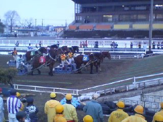 ホントにホントに間が空いてしまい申し訳ないです。とうとう組合によるばんえい競馬が終わり解散。そして4月の末から新生ばんえい競馬のスタートとなりますが。今回の写メホントはもっと早くに出したかったンダヨね。皆の(私の)大好きなばんばのアイドル、リッキーが定年まではまだ年数があるんだけどラストランをむかえました。騎乗は私でした。実はラストランだと言う事は2日前位までしらないで騎乗依頼を受けていました。そして最終12レースのパドックを見てビックリ!? カメラを持ったお客さんマスコミそして大勢の女性ファンと子供達が皆「リッキー!」「リッキー頑張って!」「ありがとう!」と口々に声をかけてくれました。まさか一般の人達が知っているとは・・・改めてリッキーの人気、知名度にスゴイよ!!って思っちゃいました。結果は惨敗でしたが障害で時間がかかっている時そして障害を降りてもゴールまで何回も止まっている時ずっと「リッキー頑張って!」と沢山の人が応援してくれました。私も「後少し、もうちょっと、頑張れ後少し!」と声をかけていました。ゴールした時のイッパイの拍手・・・彼の顔を撫でながら「お疲れさま・・・」と声をかけながら私もジーンときました。これからもスタンドな内の馬車や様々なイベントで皆さんに会う事でしょう。かわいがって下さいね! 私はサヨナラでもないのにツーショットで写真撮っちゃいました~。大切に飾っておこーっと。では