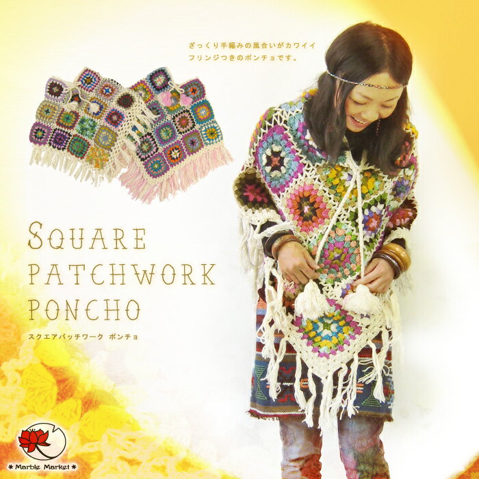 一点もの!スクエアパッチワーク ポンチョ≪メール便不可≫【エスニック ファッション アジアン アウター 秋 冬】【RCP】【★】