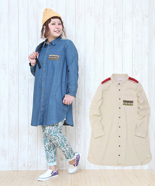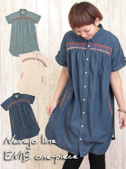 【今だけ送料無料】ナバホラインEMBワンピース しっかり生地のシャツワンピース。ネイティブ柄刺繍で可愛くもクールな印象、ロングカーデとしても◎