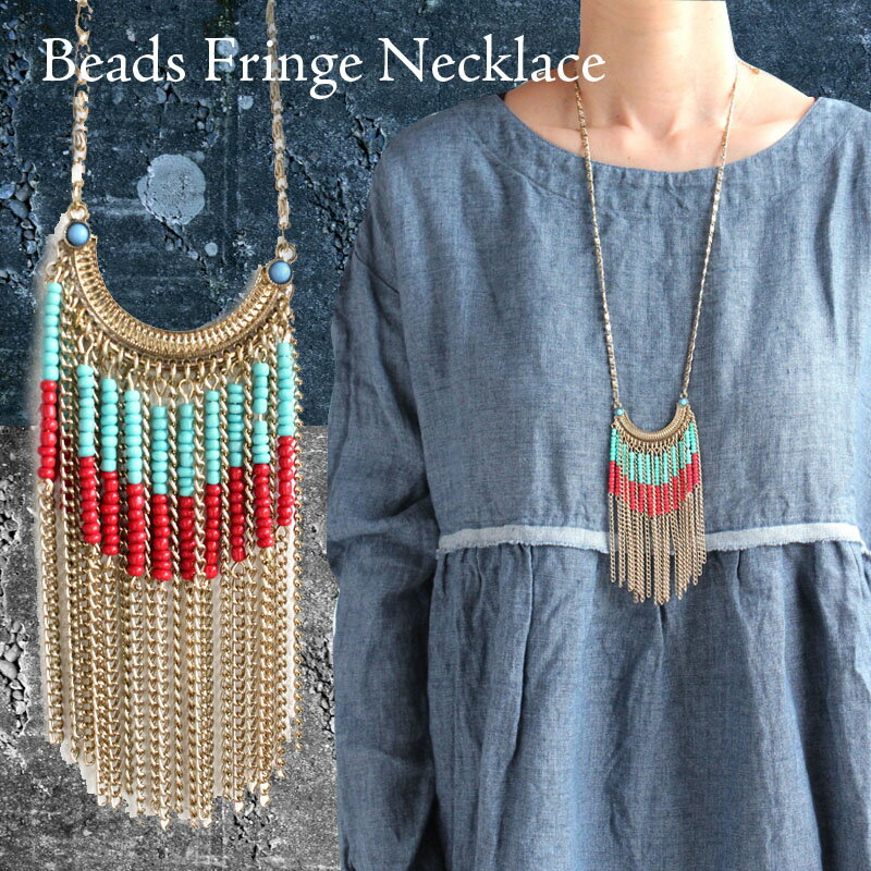 ビーズフリンジネックレス*ターコイズ/派手 ネックレス/民族調アイテム/フリンジ