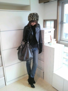 今季はひゃんさんが、ライダースJKコーデをたくさんUPしてくれているので、参考にしてま~~す。黒系でまとめたコーデに、ヒョウ柄のファー帽子がアクセント。こういうやりすぎない小物使いがおしゃれだわ。黒コーデのアクセントになるヒョウ柄帽子を持ってないので、とりあえず手持ちの帽子でアクセントになりそうなノルディック柄耳あて付きニット帽を合わせてみました。耳にあたる部分が茶系のラビットファーでかわいいです。コーデ品ノルディック柄耳あて付きニット帽:ソニプラで購入ラムレザー リブジャケット ブラック:JTP TRADINGカシミアタートルニット:UNQLOスキニーデニム:UNQLOミネトンカ ウッドストック:MINNETONKAこれほしいなリブウールハンドウォーマー1995円フォックスファーポンポンストラップ1000円直径13cmのおっきなポンポン送料込