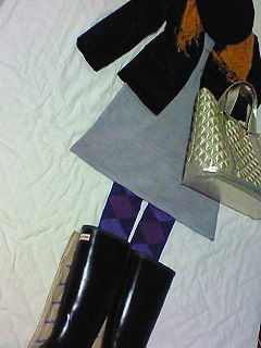 今日は朝から雨で憂鬱でしたね。パープル系のアーガイルタイツを買ったので、さっそくコーデに取り入れてみましたニットベレー:UNIQLOベロアJK:UNTITLEDニットワンピ:g.u.キルティングトート:MARC JACOBSラバーブーツ:HUNTERショール:NATURAL BEAUTY BASICアーガイルのタイツは300円ショップで買いました茶系のもありましたよん。はやりものはお安く取り入れます。ショールはオレンジっぽく写っているケド、マスタード色です。パープルとマスタードって相性いいですよね。