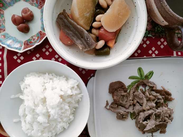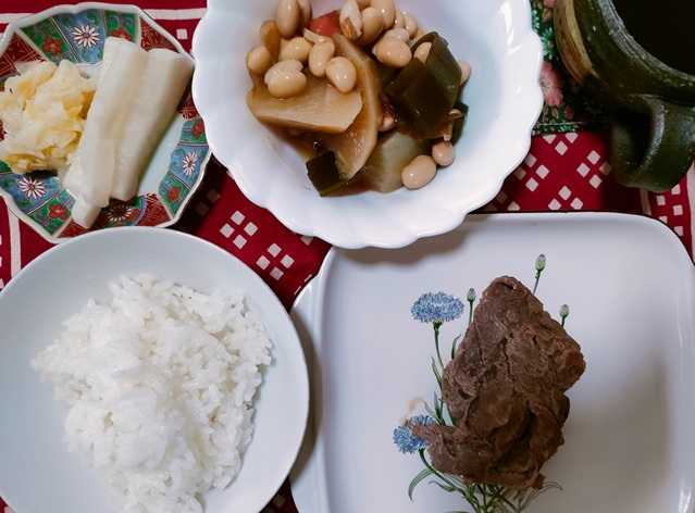 こんにちは^^朝のうっとおしい空は今はカラッと晴れています^^寒くなりました。気温は下がっていましたが 少し昼間はましに。今日はもよしりんの四毒抜きの食事に挑戦です^^今日はね牛肉の薄切り肉を塩コショウで焼きました。油は自ら出る油のみ。結構上手に焼くことが出来たと思います^^大根、人参、昆布、こんにゃく、大豆を含め煮をしました。味付けは かつお節と醤油のみ。梅干しごはんとなっています。今日も満腹^^ご馳走様でした。<m(__)m>感謝~