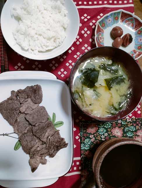 こんにちは^^今日は雨になっています。降ったり止んだりなのでしょう。。朝の教室後 お昼となっています。今日はお肉です^^そして イワシの水煮で出たものを使って味噌汁にしました。梅干し ご飯となっています。今日もよしりんの四毒抜きの食事に挑戦です^^お肉はクッキングペーパーにお肉を入れ周りに少しの水で蒸し焼きです^^味噌汁はいわしの水煮汁を使って3分の2くらいになっています。後の3分の1はお水。煮汁には お酒 生姜が入っているので今回は出汁にかつお節は入れていません。具はキャベツとわかめ^^コクが出て美味でございました~ホントはねお魚のお汁物は苦手な私でしたが食べることができました~^^梅干しごはんとなり完食いたしました~<m(__)m>ごちそうさま~また夕食も挑戦いたします<m(__)m>