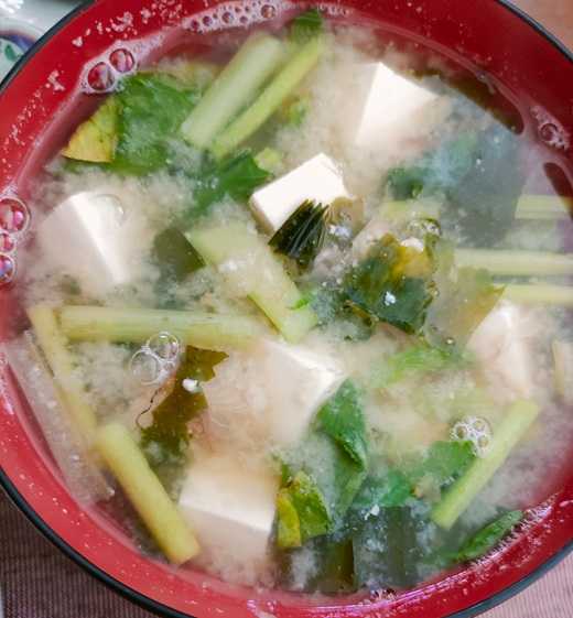 味噌汁 今日は小松菜 ワカメ 豆腐です。かつお節で出汁 味噌は
