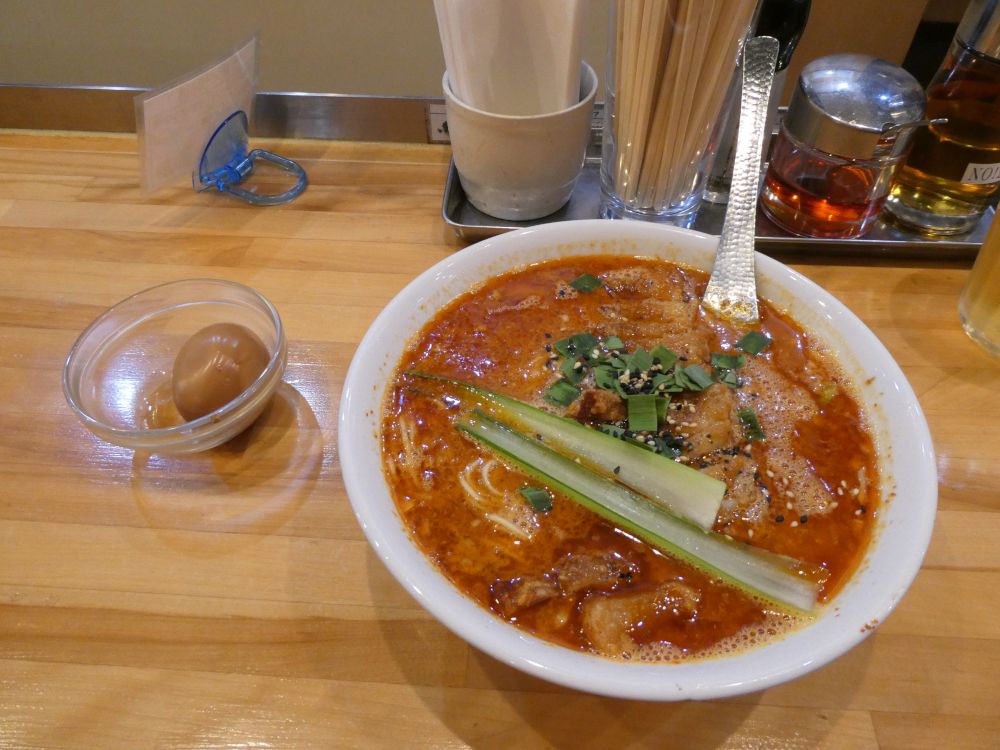 「​ 東京担々麺本舗 瀬佐味亭 ​」に入店し、パーコー担担麺のスーパーホットを注文し、クーポンでほかほか煮込み茶玉子をお願いした。