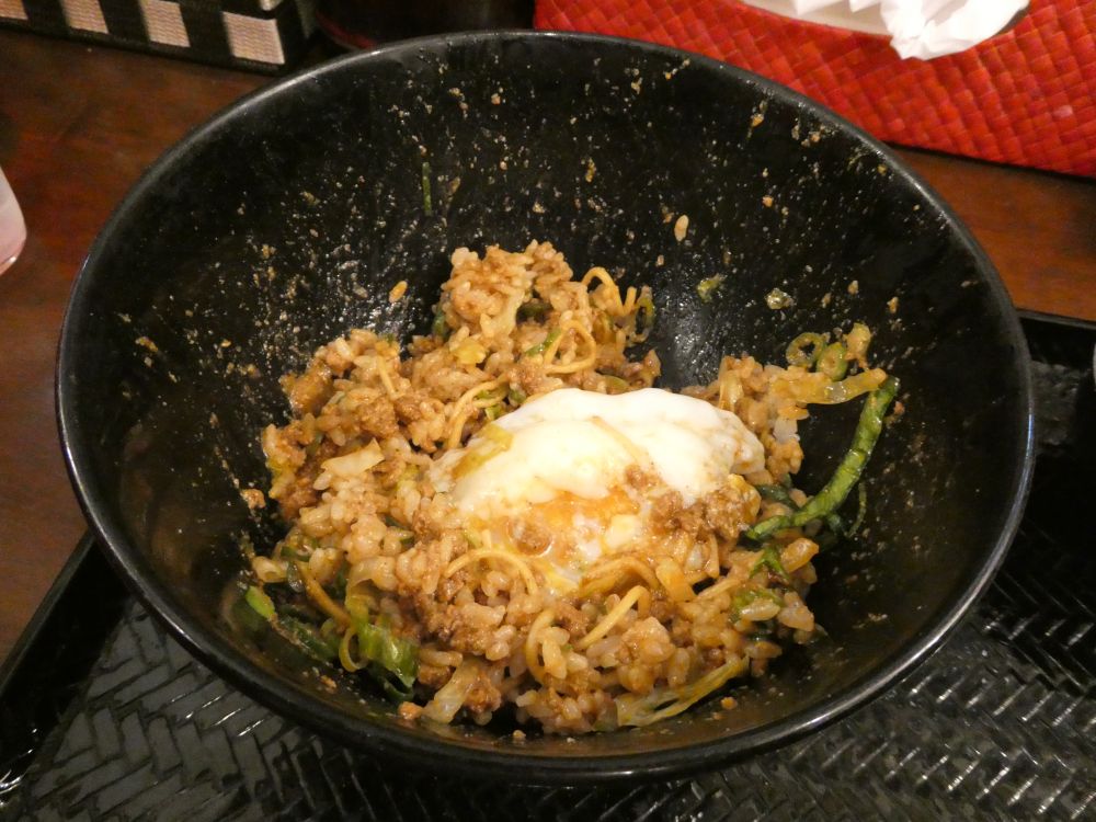 最後は残りの温玉を投入。かき混ぜてからさらに山椒、ガーリックパウダー、ラー油を投入。