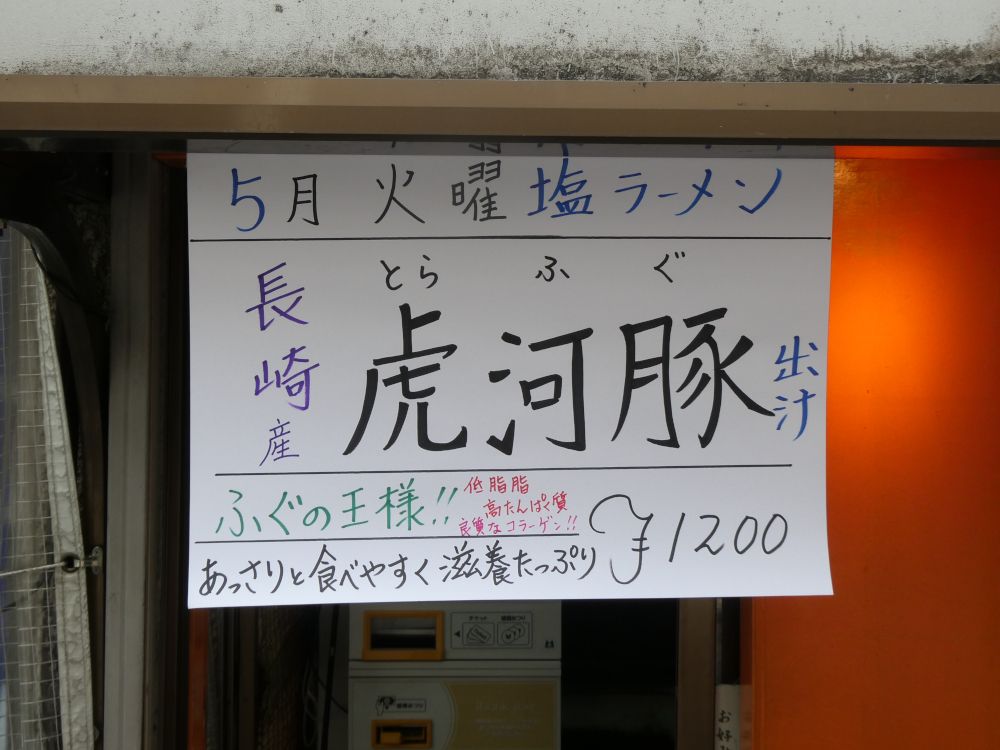 火曜日は塩ラーメンの日だが、今回は​ 長崎産虎河豚出汁を使用する塩ラーメン ​ってこと。昨日の夜に​ 及川店主のツイート ​を読んだが、朝早く起きる自信がなかったのであきらめるつもりだった。まさか来れたとは思わなかった。スペシャルと100円の食券を購入し、トラフグソースをお願いした。