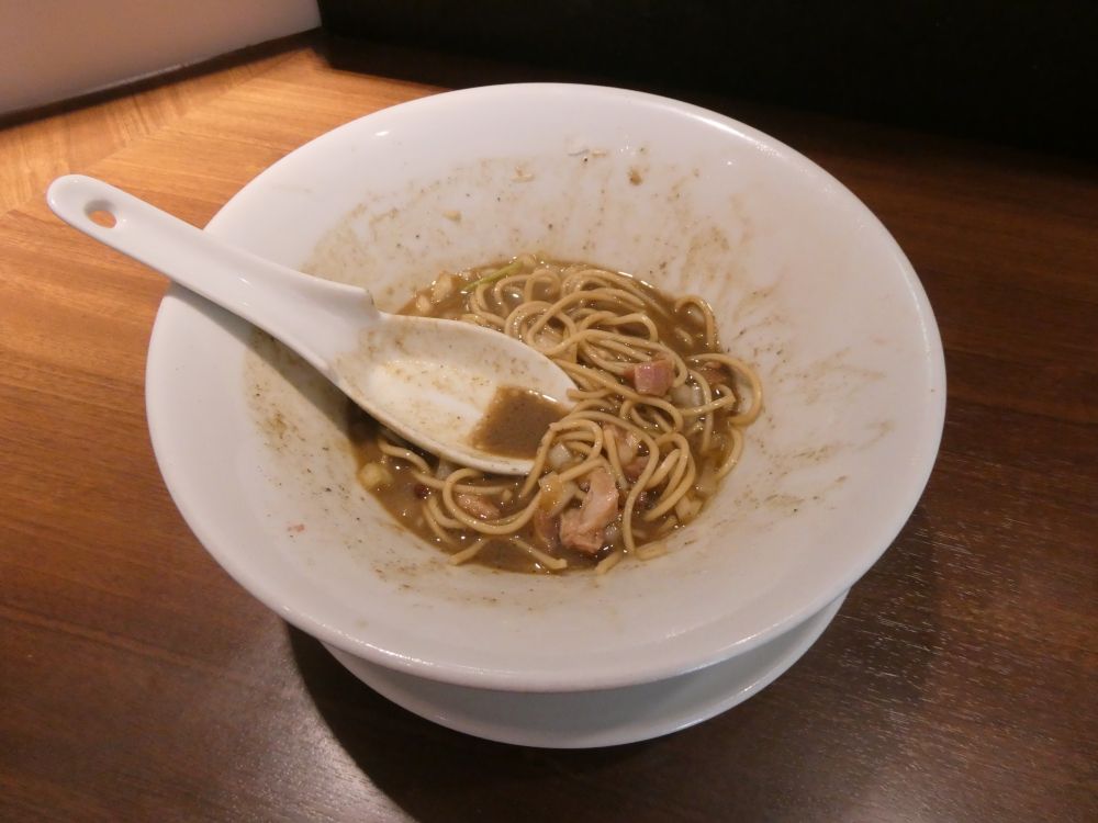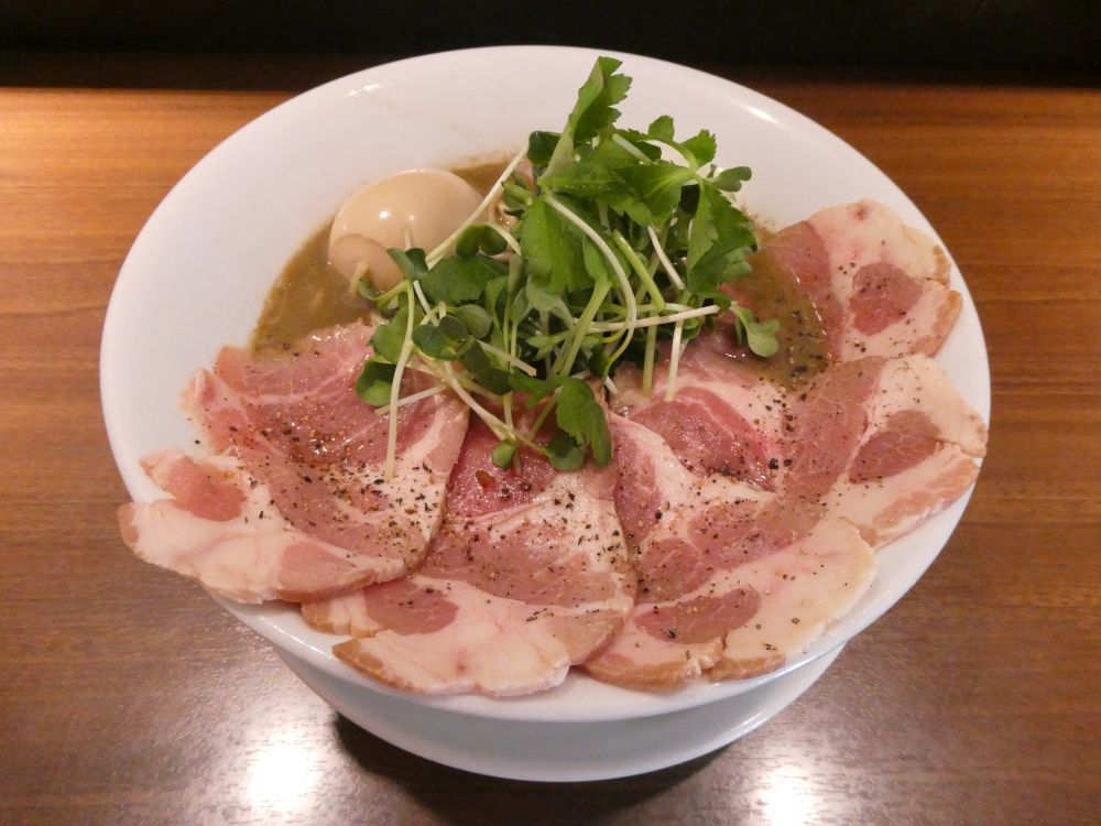 同じ鶏白湯の甘味が強いとはいえ、今日のスープは比較的に煮干しの苦みが強いと味わえた。茹で加減がややカタメの中太ストレート麺は歯切れと絡めがよい。生ハムの状態に近づいたレアチャーシューは胡椒との相性がよいね。