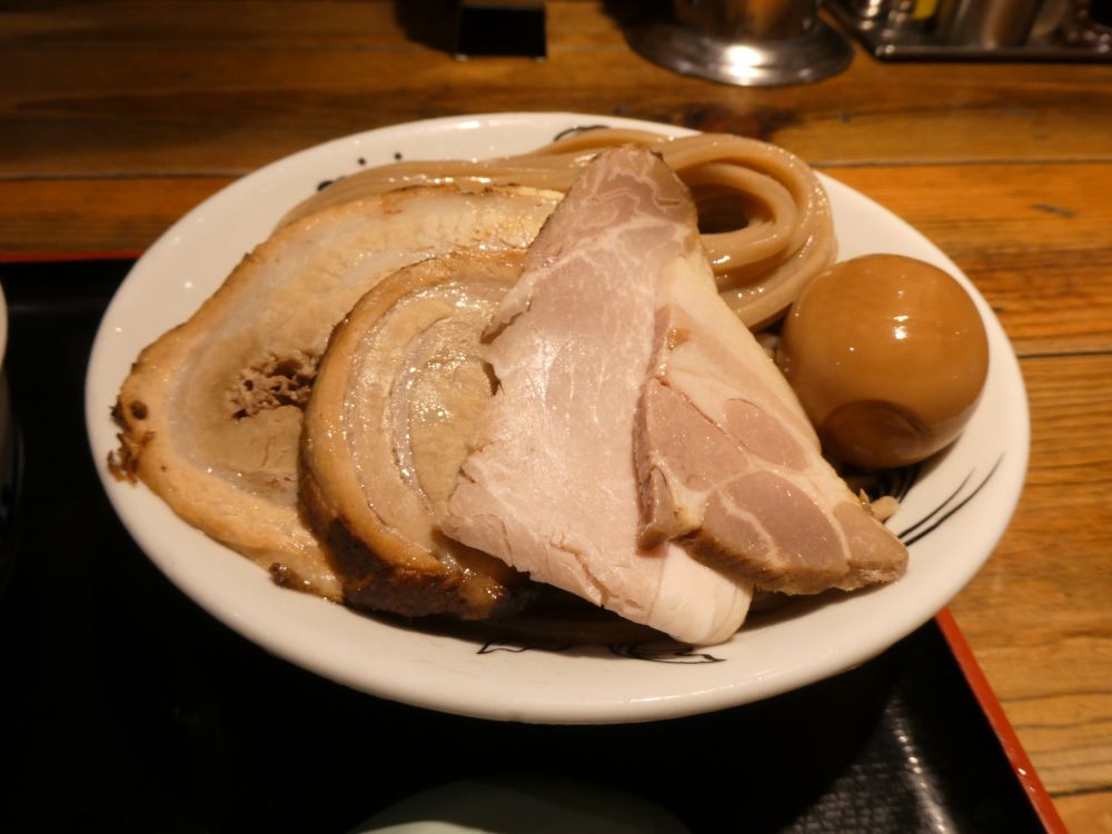 全粒粉使用の極太麺はやはりもっちりしておいしい。四種類のチャーシューはいずれも歯切れと味付けがよい。