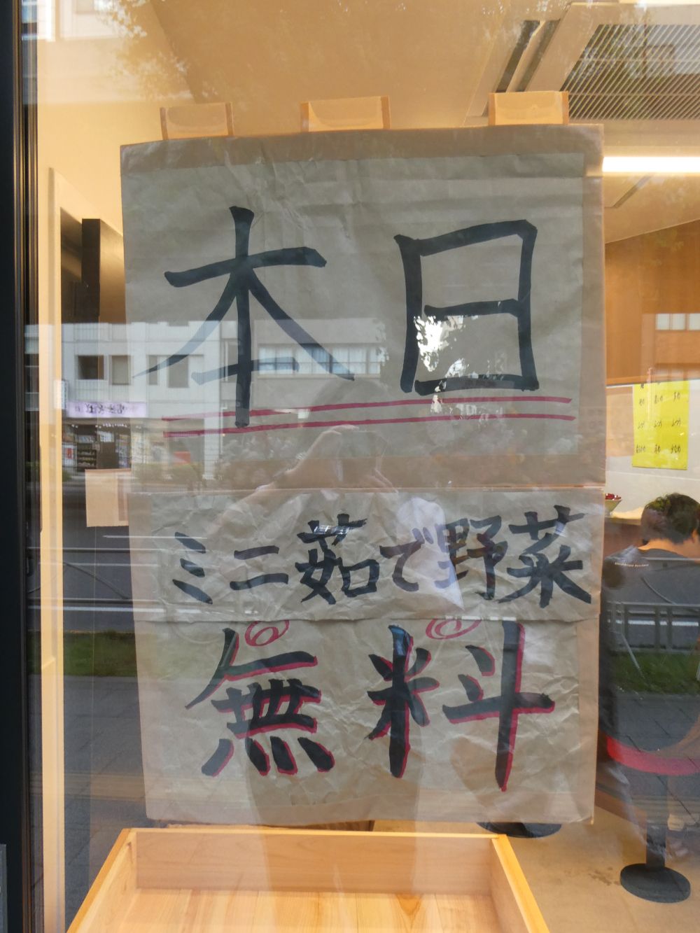 ほうれん草チャーシューメン、味玉の食券を購入し、入店しようとしたら、店頭の張り紙を見た。食券をスタッフに渡した際に、カタメ、コイメ、アブラ多めをお願いした。もちろん、無料のミニ茹で野菜もお願いした。
