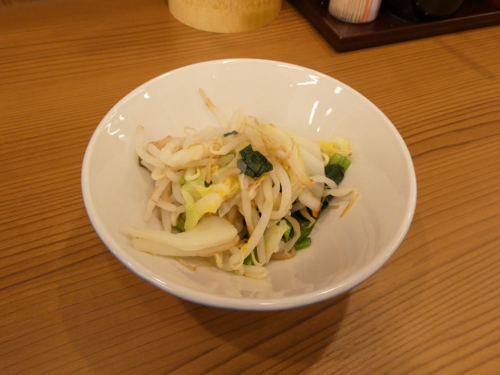麺が提供される前にまずはミニ茹で野菜の登場だ。もやしがメインで、醤油もかけてあるね。