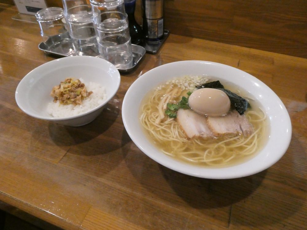 何を食おうかと考えながら歩いたが、ちょうど「らーめん 雅ノ屋」が開店したので、入店し、ランチAセット(塩らーめん、チャーシューごはん)、半熟味付玉子の食券を購入してから着席。