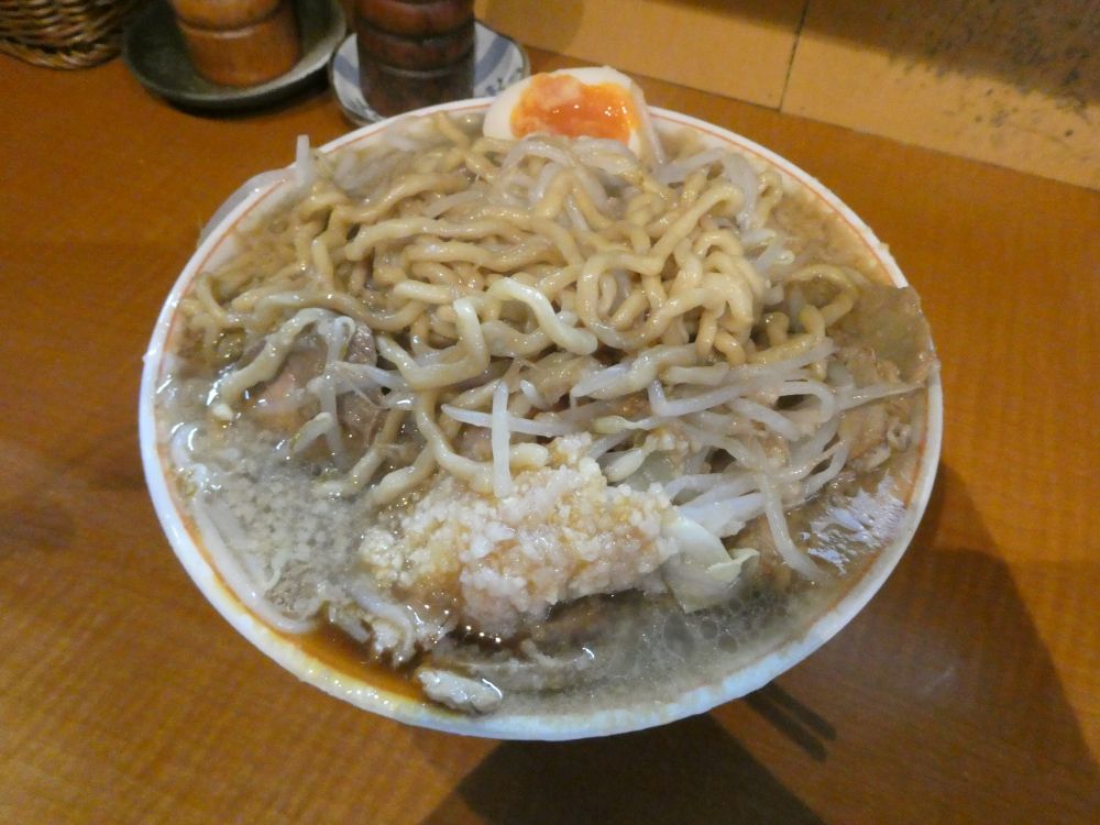 とりあえず天地返し。豚骨醤油スープは多くのインスパイアが出した乳化したものではなく、むしろ醤油タレが効いたのだ。それでも豚のうま味がしっかりしているからこそ多めのニンニクと合っている。。丸い縮れ中太麺は二郎本家に比べ量が少なめのほうだが十分に多く、もちもちした食感で、スープとの相性がよい。麺の太さだから野菜と一緒に食べやすい。チャーシューはややカタメで歯切れがよく、脂身が少ないのでわしの好みだ。