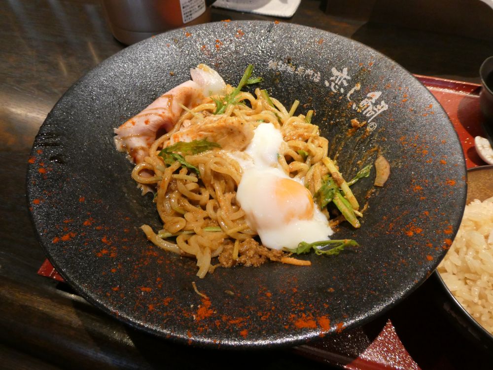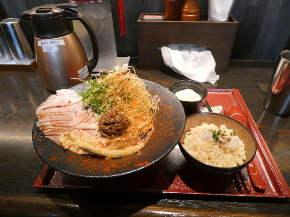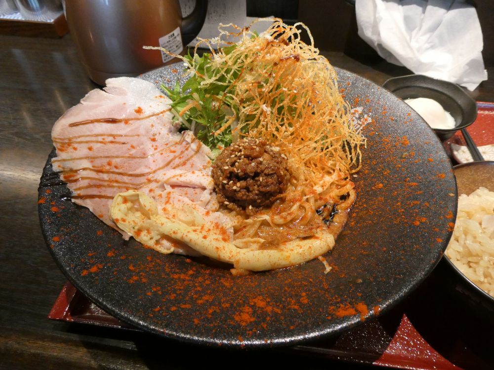 けっこう豪勢そうだね。しかもトッピングの載せ方は綺麗だ。かき混ぜれば惜しいって感じもするが、汁なしだからかき混ぜないとダメだね。