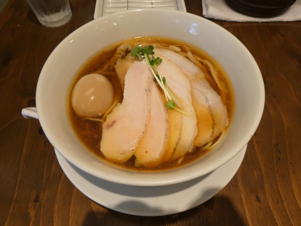 しばらく待ったらご対麺。鶏油も浮いているね。一口を飲むと、清湯スープに相応しくない鶏の旨味が口の中で半端なく溢れてきた。鶏油も効いているのでややオイルだが想像より飲みやすい。醤油タレよりも出汁と鶏油が突出した味わいだ。心の味製麺による細麺はしなやかで弾力と絡めがよい。チャーシューは鶏チャーと豚チャーの二種類だ。鶏チャーは歯切れが良い。豚チャーは柔らかい。