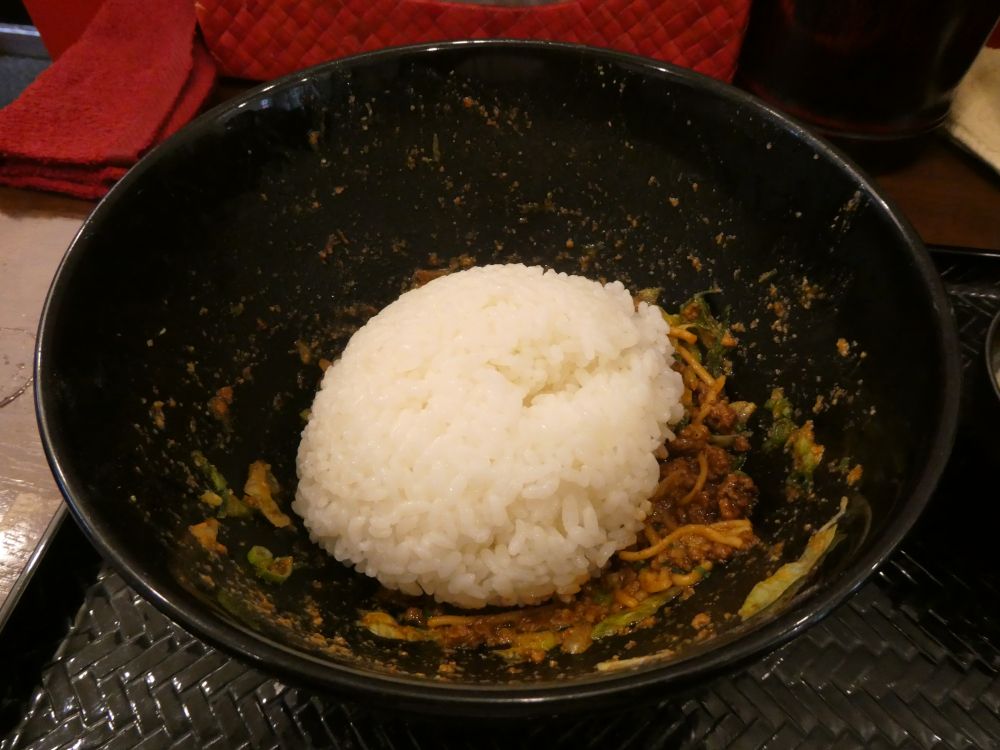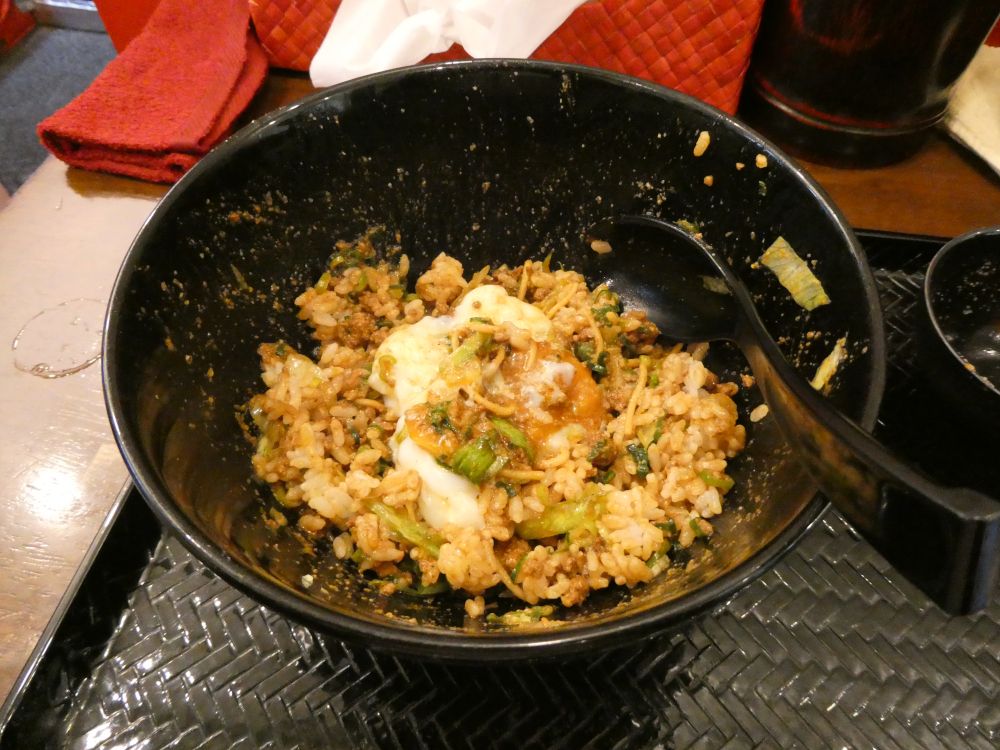 かき混ぜてから少し飯を食うのだ。ここで温玉を投入し、さらにかき混ぜるのだ。痺れもここまで少し弱まったようなので、大量なガーリックパウダーだけではなく、卓上の山椒まで投入。