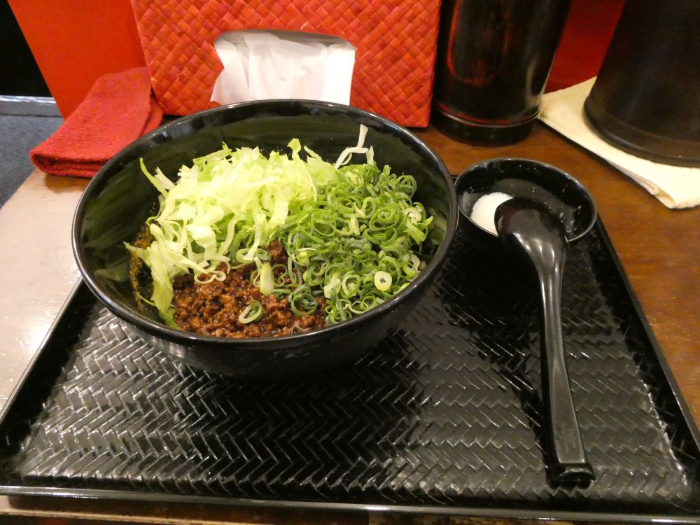 治療の時間がちょっとかかったので、11時20分頃に湯島界隈に到着した。​ このパターン ​なら自然に「​ 広島式 汁なし担担麺 湯島ひよこ堂 ​」へ行くね。​ 今日の昼に営業する ​ことも確認できたので、そのまま店へ。すでに先客がいる。いつもと同じ汁なし担担麺(麺140g)セット(汁なし担々麺・温泉卵・白飯)の食券を購入し、店主に渡したら、もう少し辛くすることができるということで、辛さを4辛いから少しプラスでお願いした。
