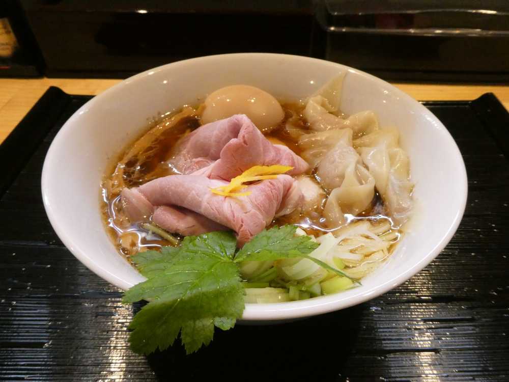 魚介と動物系のバランスがよく取れている醤油味の清湯スープはやはりおいしい。柚子もアクセント。塩もおいしいが自分にとって醤油のほうがインパクトがある。縮れ中細麺は絡めと歯切れが良く、スープと合っている。大きいワンタンは肉餡もしっかりしているし、皮ももちもちして、クオリティが高い。レアチャーシューは大きいし歯切れも良い。