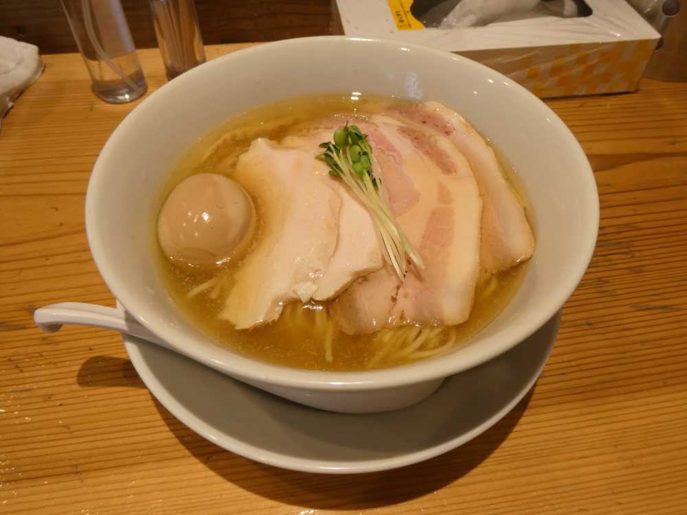 とりあえず仕事の準備の前にブランチをしっかり摂ろう。「​ 麺屋 鈴春 ​」の前に行列がないので、入店した。何を食おうと考えているところにすぐ後客が次々に並び始めたので、もはや考える余裕がなくて、​ 前回 ​と同じ、特製塩らーめんの食券を購入してから着席。