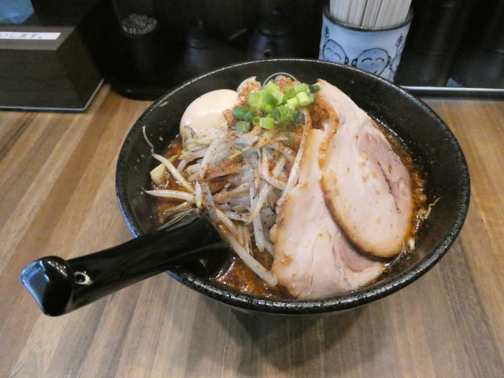 当然、天地返しをやってしまった。カラシビに慣れているので、ここの大辛の辛さと痺れも普通と感じられたが、焦がし味噌スープとの相性がかなりよいと思う。マー油も使用したかな。スープの中にもニンニクの粒があるので、ニンニクの増量もできればよかったかも。平打ち中太麺は茹で加減がカタメで、歯ごたえと絡めもよく、コシもあり、スープとの相性が良い。二郎インスパイアとして考えればもやしと麺の量が軽量級だが、わしにとってちょうどよい。バラ肉チャーシューは大判で歯切れと味付けが良いし、油っぽくない。