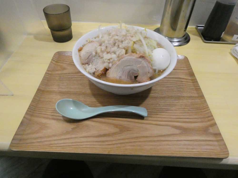 席番号を呼ばれたら食券カウンターへ。店主から呪文を聞かれたら、ニンニクましまし、アブラとお願いした。渡された丼を乗せたトレーを持って席に戻った。