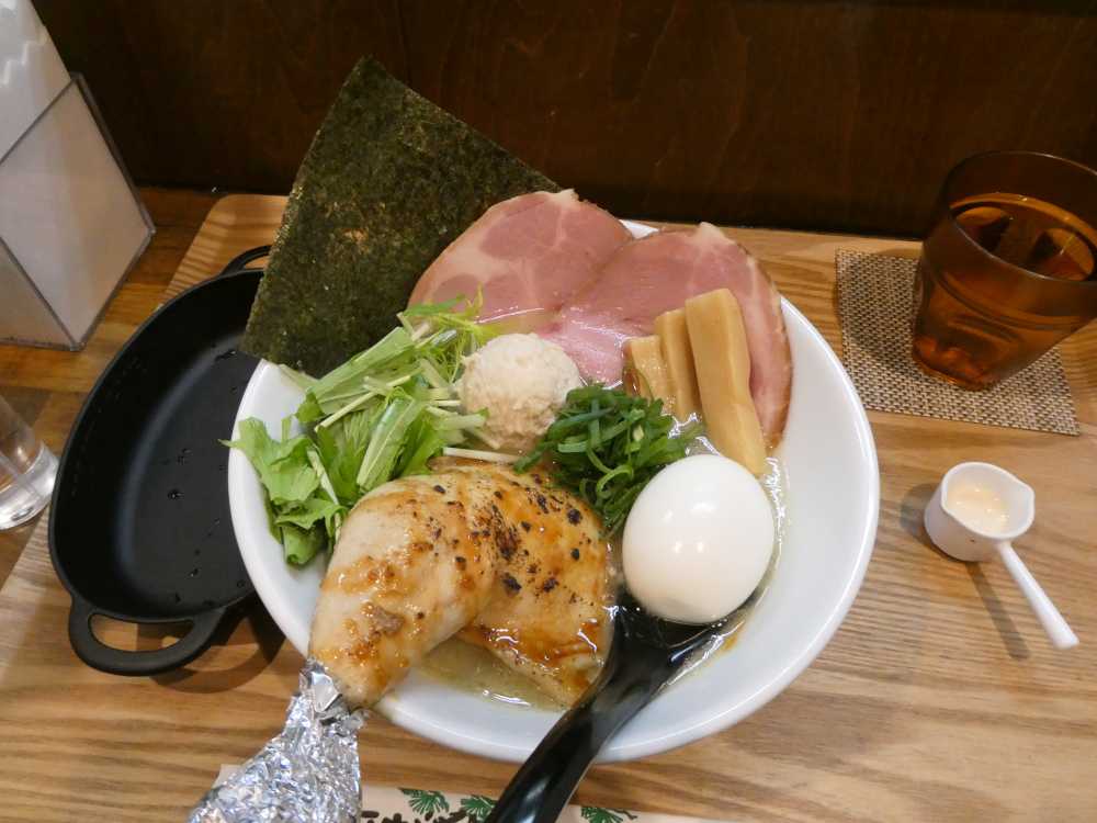 特製とは玉子、メンマ、のり、つくね1個、りんごチャーシュー1枚、水菜のせってこと。チキンレッグまで入っているので、麺の持ち上げだけではなく、レンゲでスープを食うのもちょっと難しくなった。スープは洋風で甘味がかなり出ているがまったくしつこくなく、飲みやすい。縮れ平打ち太麺はもっちりして、こってりしたスープとの相性が良い。チキンレッグは柔らかいし、洋風のトッピングなので味付けもスープと合う。りんごチャーシューは肩ロースで歯切れが良い。つくねも味付けがしっかりしている。
