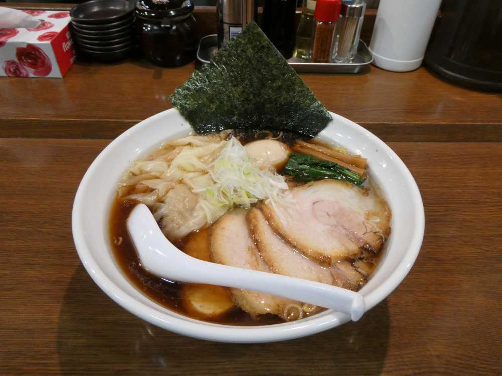 醤油スープは醤油タレがコイメで出汁がしっかりしている。個人的に店主は白河ラーメンを意識したと考えているが、鶏油が効いたわけではない。縮れ太麺は当然白河ラーメンと違ったが、もっちりして、絡めと歯ごたえもよい。モモ肉のチャーシューは炭火焼きで確かに白河ラーメンに近い味付けで、歯切れがよい。バラ肉は煮豚で柔らかい。ワンタンは餡が小さいが薬味が効いていて、皮ももちもちした食感だ。