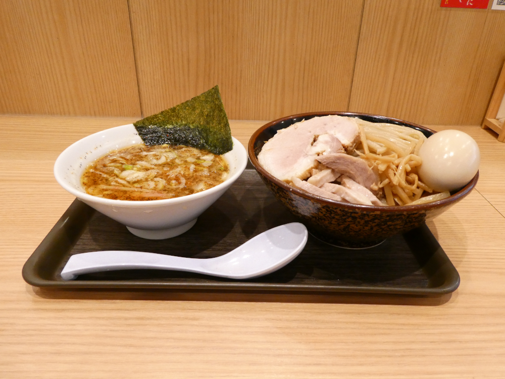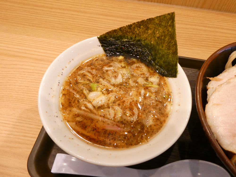 とはいえ、東池袋大勝軒系のつけ汁は元々香辛料が効いている。舎鈴の中太ストレート麺はもっちりしてスパイスが効いているつけ汁との絡めもよい。刻み切チャーシューはレギュラーで、厚手のチャーシューはトッピングのもので、歯ごたえがよい。