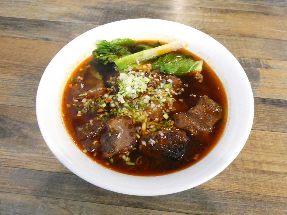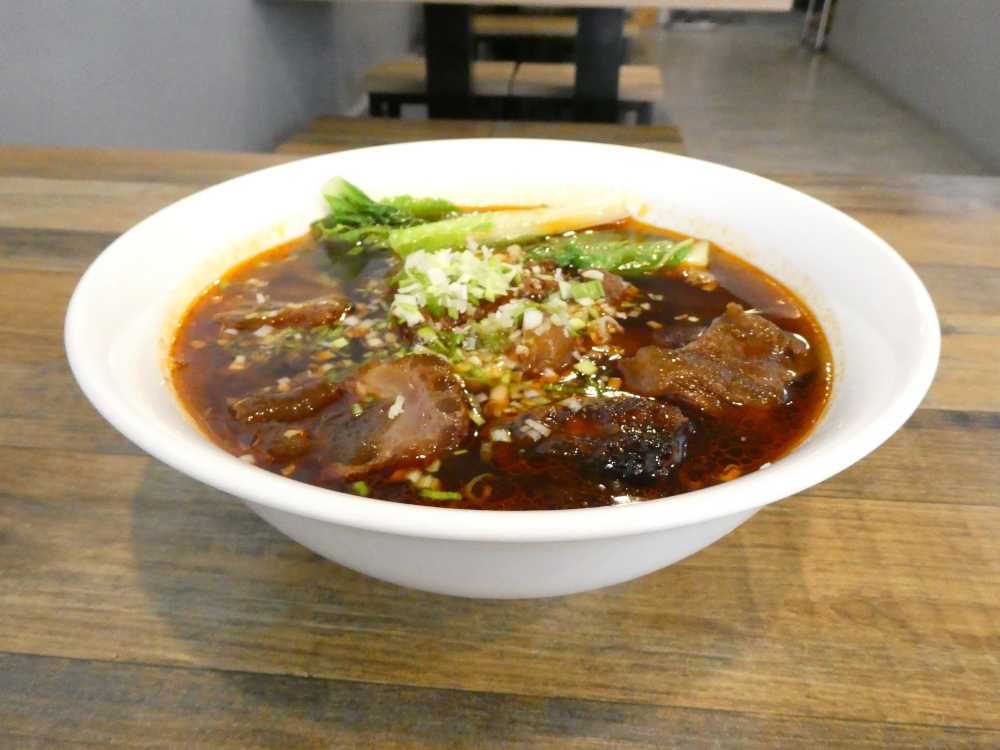 ラー油も効きそうだし、醤油タレの色も濃そうだが、食べやすいのに出汁のコクがしっかり味わえた。縮れ中太麺はまるでうどんのような弾力でスープとの絡め通い。味付けが濃い目の牛すね肉は柔らかいが歯切れがよいぐらいな固さだ。牛筋もプリプリで、確かに口コミ通りで醤油スープと合う。