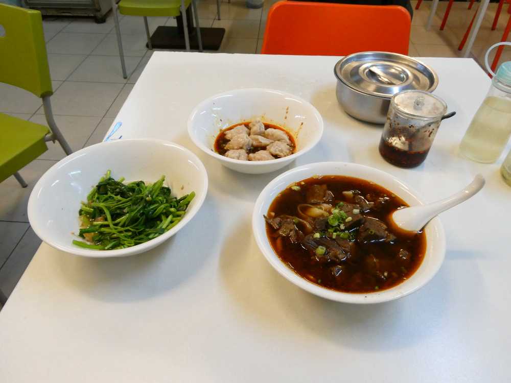 せっかくだから、​ 1週間ぐらいぶり ​にこの界隈で夕食を摂ろう。淡水駅界隈で最も有名な​ 喜楽牛肉麺 ​が営業しているためそのまま入店。この前に店の定休日に店を通りすがったら看板がないとびっくりしたが、台風に看板を飛ばされたが通常に営業しているってことを後にネットで確認できたためほっとした。紅焼牛肉麺、紅油抄手、燙青菜を注文。