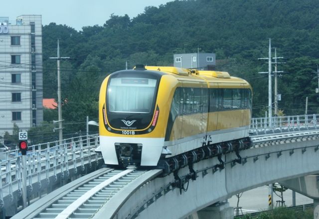 これが2両編成の仁川空港磁気浮上鉄道の車両。無人運転なので先頭・後尾は前がよく見えます。(いずれも龍游駅で撮影)