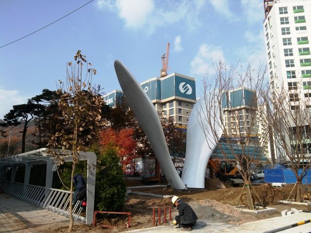 一番北側の広場にはこんなモニュメントが。いろいろあったロッテグループの願いをこめて羽のオブジェでさらなる「飛翔」ということでしょうか。